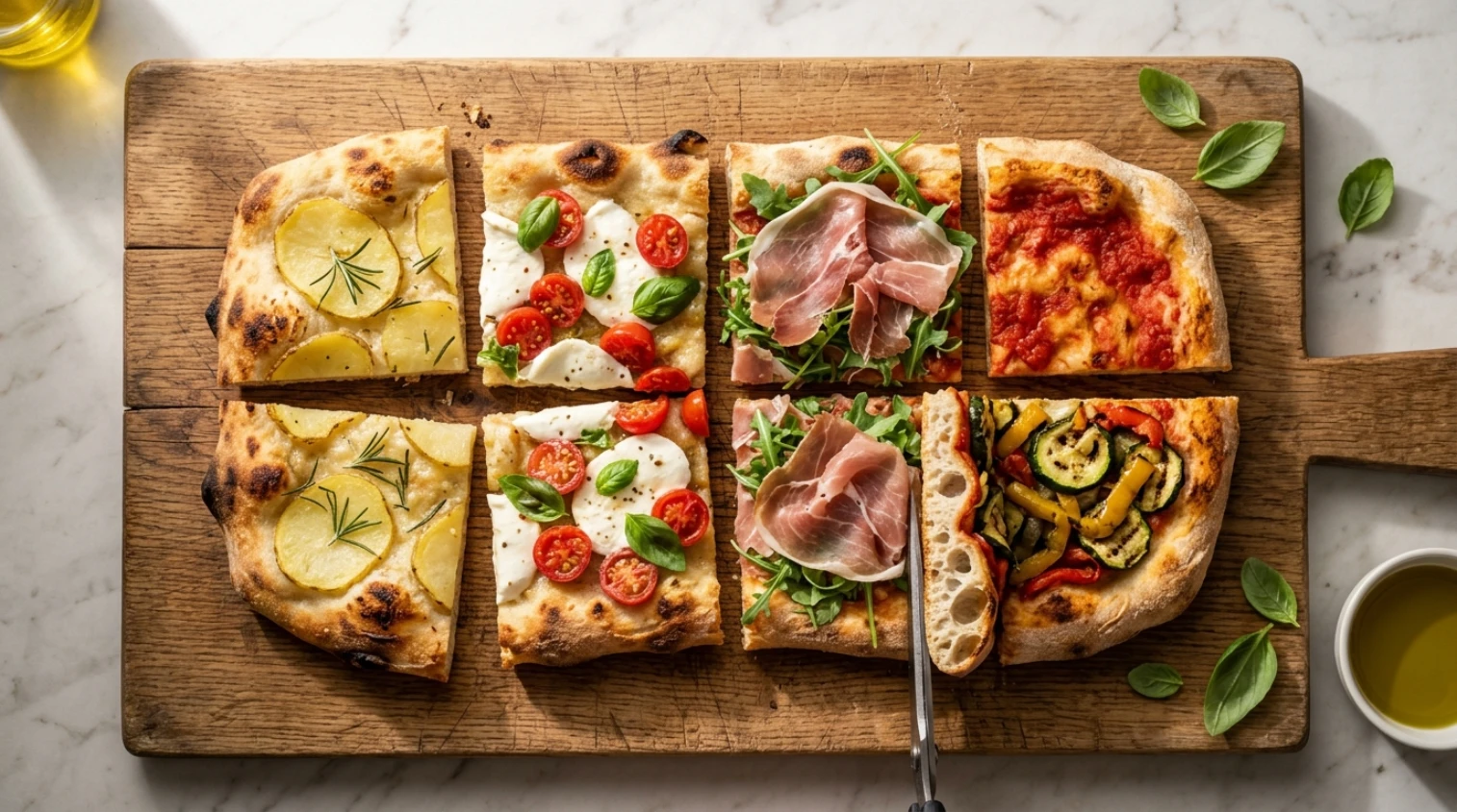 Pizza bianca al taglio to wersja bez sosu pomidorowego – tylko ciasto, oliwa i sól morska – podczas gdy pizza rossa pokryta jest prostym sosem z pomidorów pelati jako bazą dla dalszych składników. Te dwa style stanowią fundament tradycji pizzy al taglio w Rzymie.